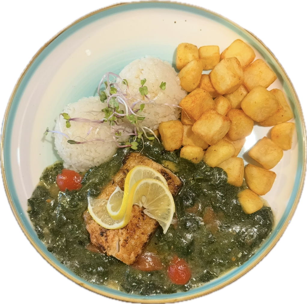 Grilovaný filet z tresky tmavej na špenátovom lôžku, 1/2 ryža 1/2 opekané zemiaky