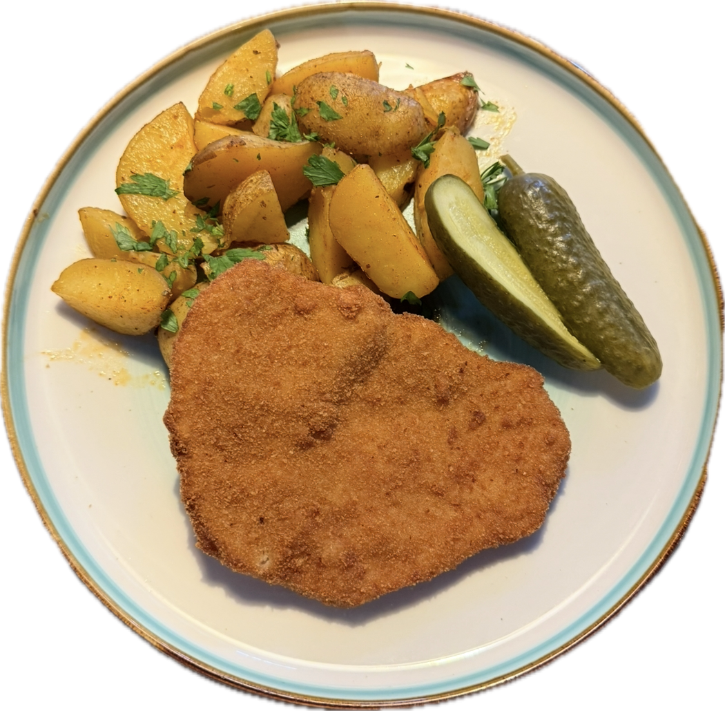 Vyprážaný bravčový rezeň, pečené zemiaky, kyslá uhorka