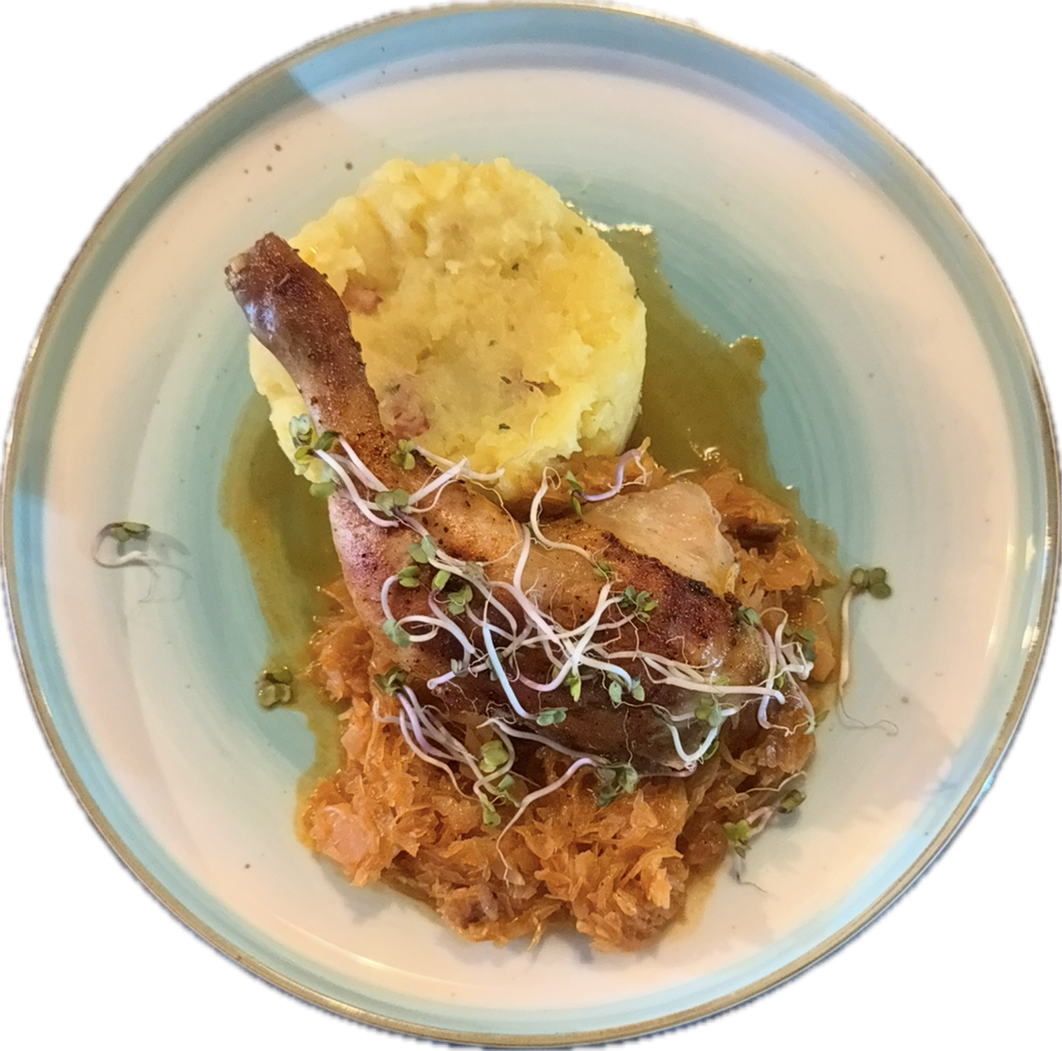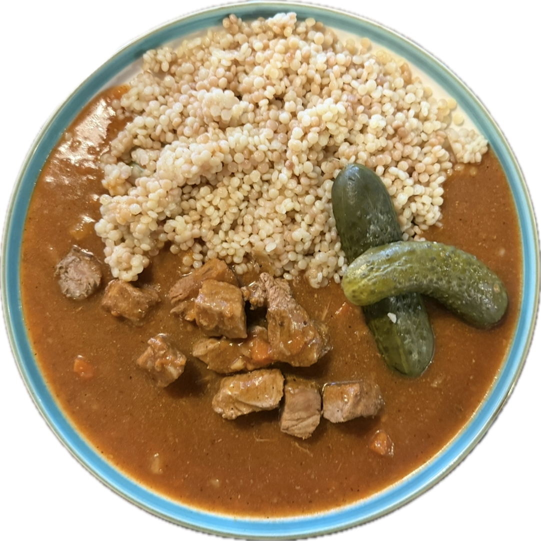 Bravčové plátky na šampiňónoch, tarhoňa, kyslá uhorka