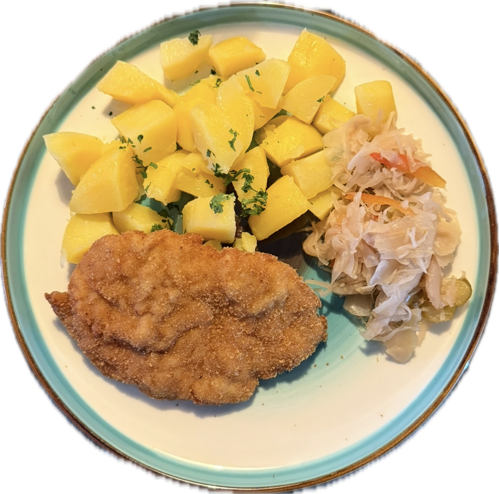 Vyprážaný bravčový rezeň, varené zemiaky, čalamáda