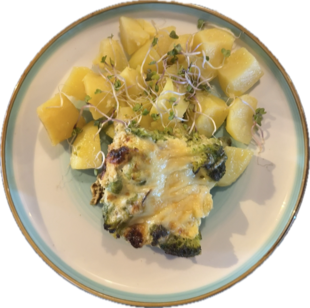 Zapekaná brokolica so syrom a vajíčkom, varené zemiaky