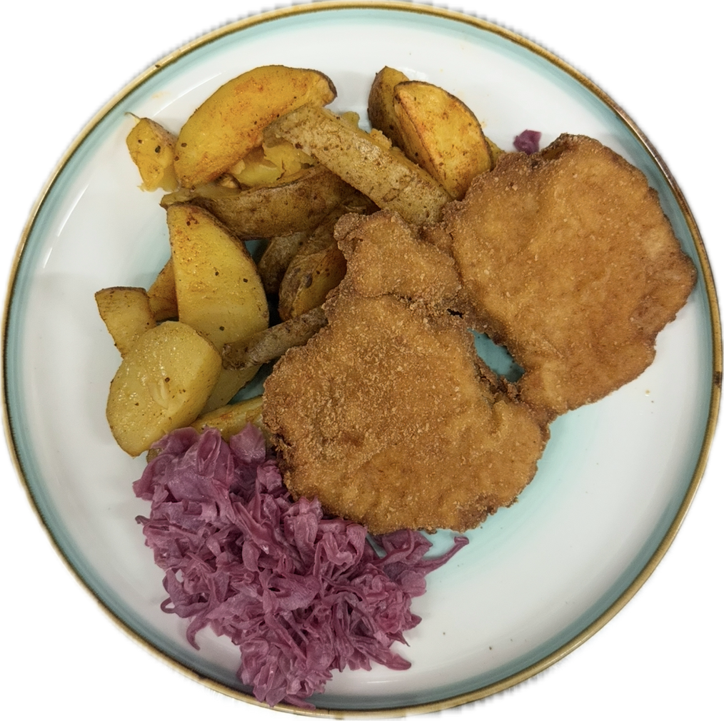 Vyprážaný bravčový rezeň, pečené zemiaky, hanácky šalát