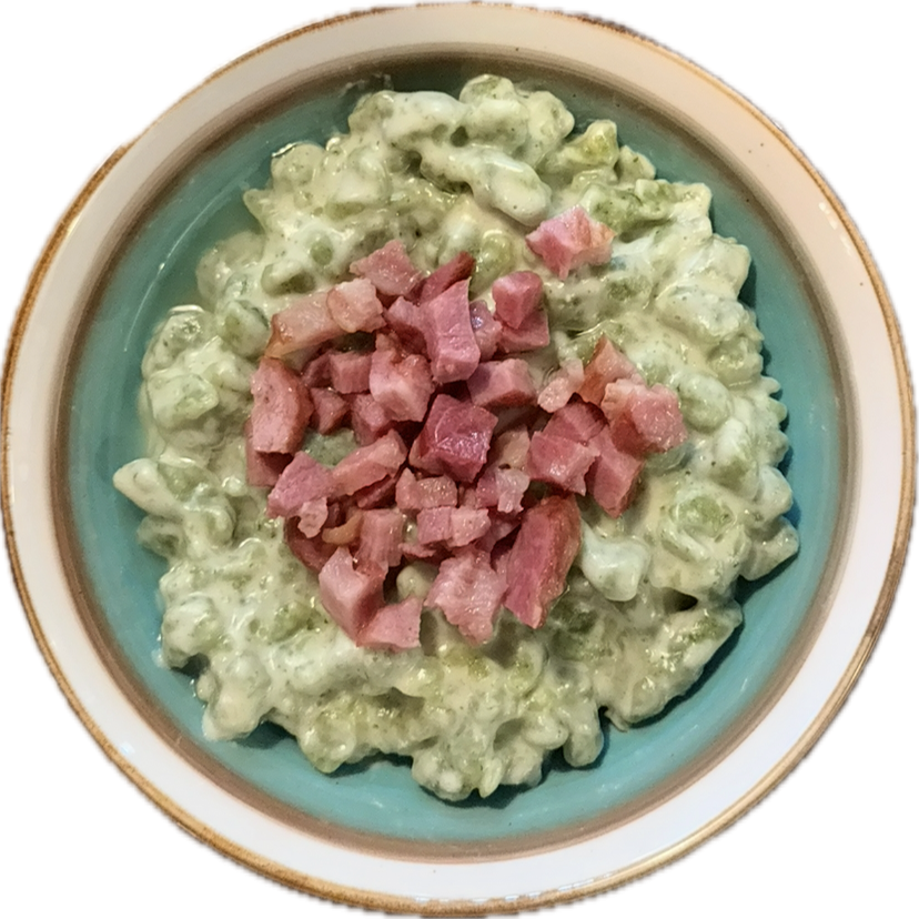 Špenátové halušky so syrovou omáčkou a údeným mäsom